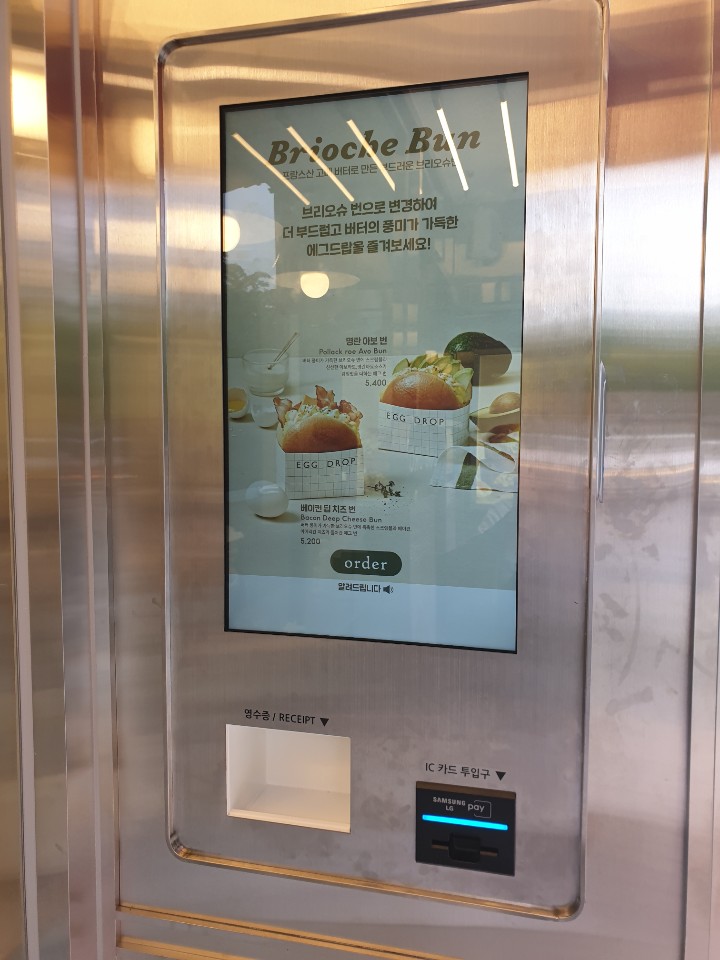 키오스크로 갈릭베이컨치즈를 주문하였습니다. 프랑스 고메버터로 만든 브리오슈 번으로 빵을 교체할수도 있습니다. 덧붙이자면 제가 지금 까지 본 키오스크중에 가장 세련된 디자인이였습니다. 깔금한 벽걸이 tv처럼 벽안쪽에 매장시키니 자리도 차지하지 않고 분위기도 살리네요.