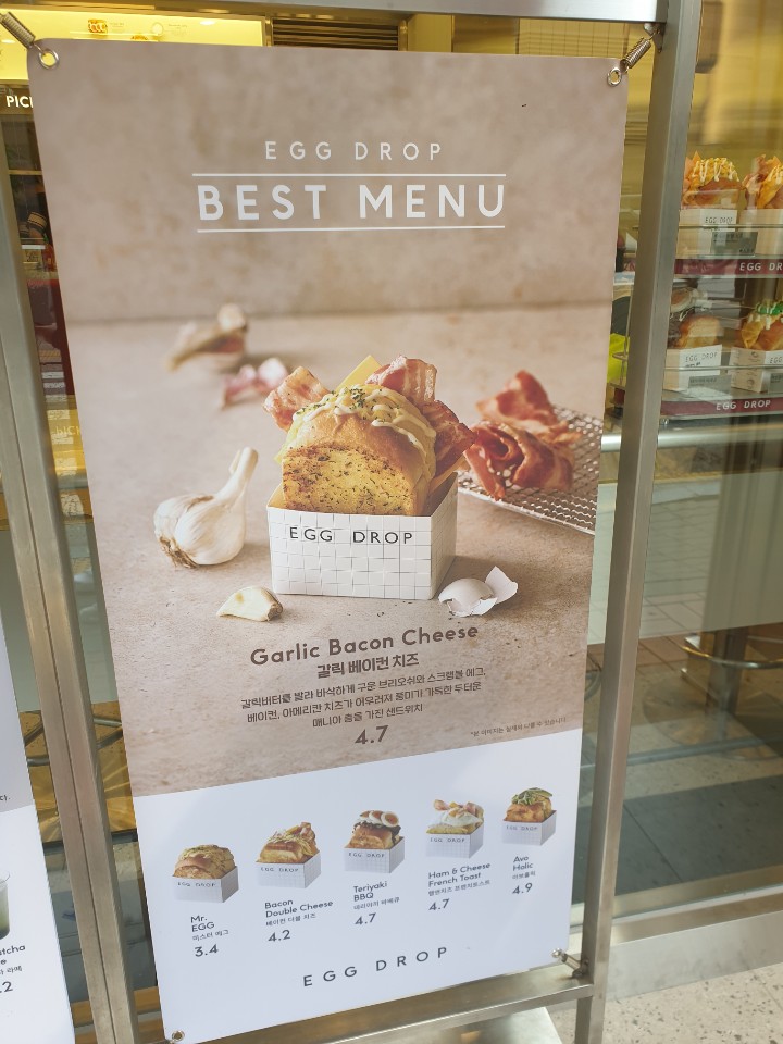 베스트 메뉴로 갈릭 베이컨 치즈를 팔고 있었습니다. 빵을 구울때 갈릭버터를 활용해서 풍미가 대단할 것 같습니다. 다른 메뉴로는 가장 기본이 되는 미스터에그, 베이컨 더블 치즈, 데리야끼 바베큐, 햄앤치즈프렌치 토스트 등으로 가격대는 4천원 중반대 정도였습니다.