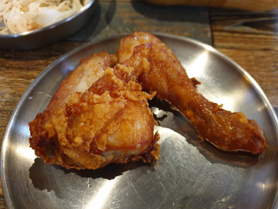 3명이서 한마리를 시켰는데 사장님께서 배려를 해주신 건지 닭다리 부분 3개 + 날개 부분 3개씩 내주셨습니다. 처음에는 이게 치킨 한 마리인가?! 하고 굉장히 의아해하였습니다. 하지만 다시 생각해보니 오히려 좋다고 느껴졌습니다. 저희 일행은 닭다리를 좋아하는데 서로 먹으려고 눈치싸움을 하지 않아도 돼서 마음이 편했습니다. 하지만 조금 아쉬운 점은 치킨이 크지가 않아서 양이 적게 느껴졌습니다.