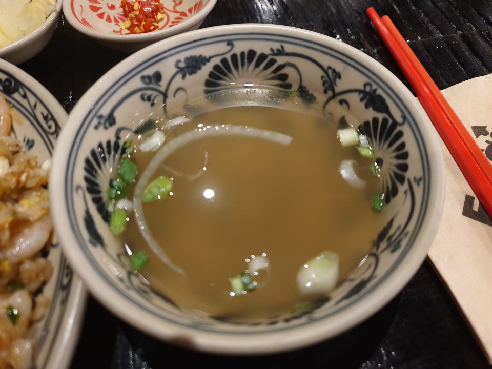 10분정도 기다리자 따뜻한 국물과 함께 새우를 듬뿍 넣은 볶음밥이 나왔습니다. 간장베이스에 양파와 계란, 각종 야채를 윤기 나게 볶은 것이 너무 먹음직스럽네요. 위에 오이로 데코레이션을 해주셨습니다. 저는 오이의 수분감을 좋아해서 중간중간에 입이 씹는 맛으로 재미있었습니다.