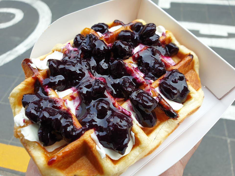 노릇노릇하게 구워진 와플, 고소한 크림치즈, 달달한 블루베리가 만나서 삼위일체의 완성된 맛을 보여줍니다. 저는 이곳 와플을 한마디로 표현하자면 밥처럼 자연스러운 맛이라고 하고 싶습니다. 한입먹으면 오묘하게 세 가지 맛이 조화롭게 어우러져 어떤 것 하나가 튀지 않습니다. 그래서 지겹다는 느낌이 들지가 않습니다. 마치 세 개의 공을 저글리와듯이 계속해서 지루하지 않게 맛들이 입안의 혀를 가지고 놀게 됩니다. 혹자들은 콱 들어오는 임팩트가 없기 때문에 맛이 없다고 할지도 모르겠네요. 장점이 있으면 단점이 있는 법이니 말입니다.