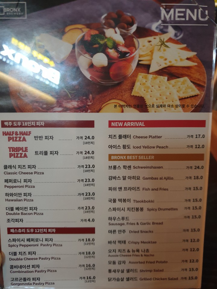 안주는 피자를 주메뉴로 판매하고 있었습니다. 다른 매뉴는 아이스 황도나 감바스, 마른안주 등 일반적인 맥주 안주입니다. 피자가 18인치이고 도우가 얇은 씬피자 위주로 파는 것 같습니다.