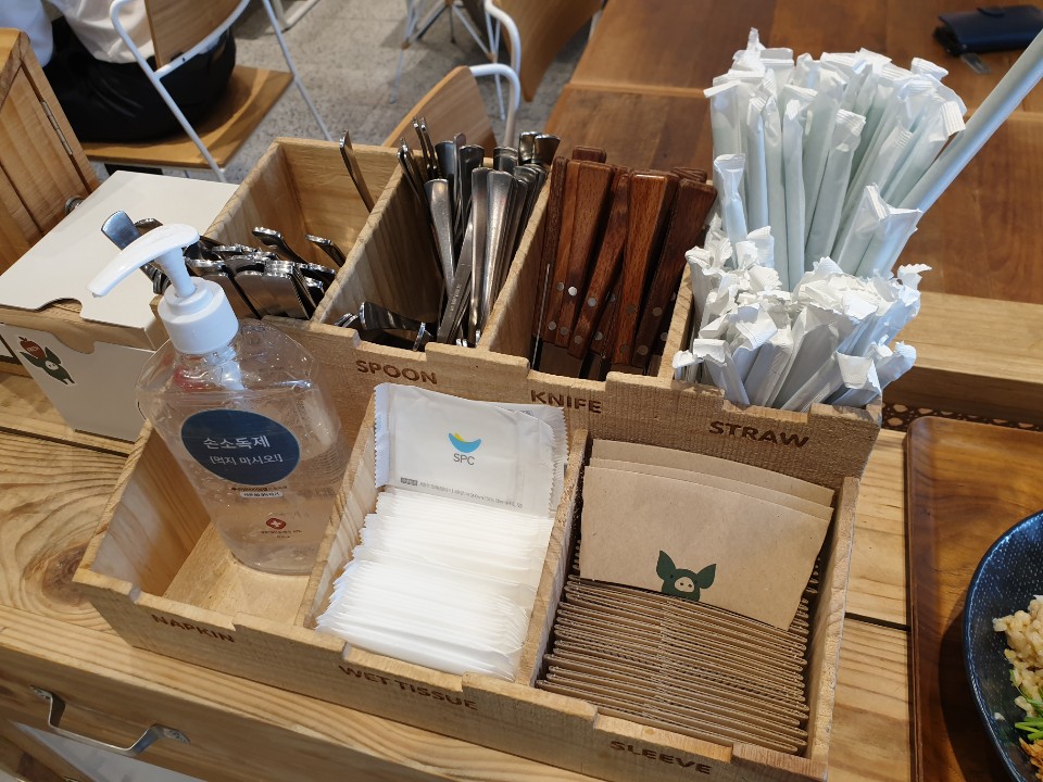 수저, 젓가락은 셀프입니다. 홀 관리 종업원이 한분 계셨습니다. 시멘트색으로 된 옷을 입고 돌아다니시면서 줄을 정리해 주거나 모르는 것을 물어보면 친절하게 대답해주었습니다. 시급이 올라가서 직원 한 명을 더 늘리는 것이 부담스러울 텐데 고객 입장에서는 홀 접대 직원 한 명이 늘어나니 체감 만족도가 확 올라가네요. 누군가가 잘 관리하고 있다는 느낌을 받았습니다. 역시 대기업이 만든 시스템은 뭐가 달라도 다르네요.