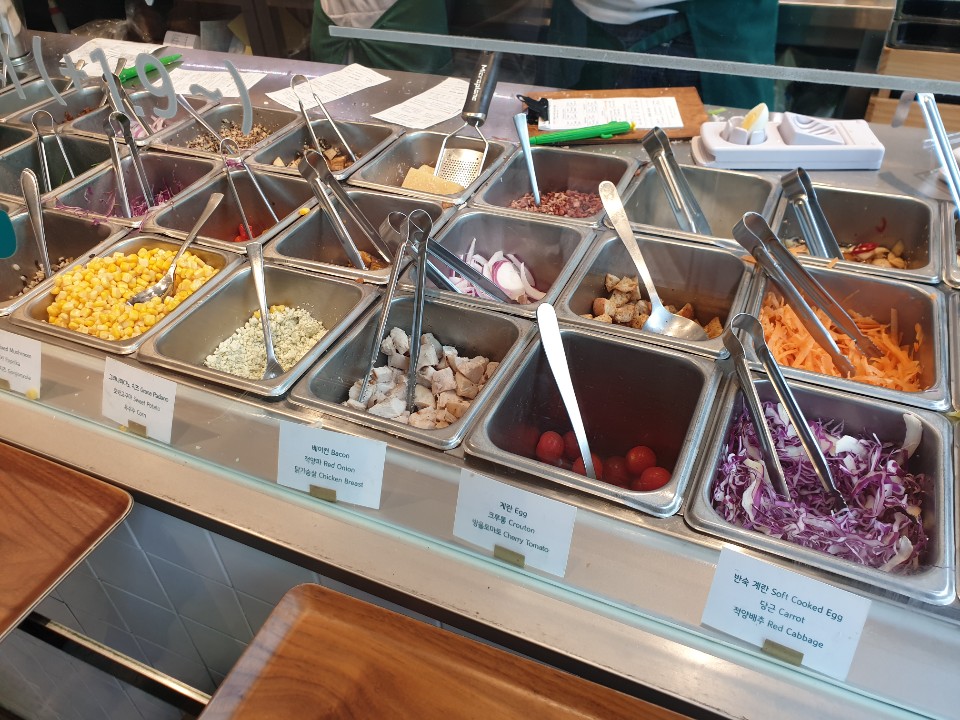 옥수수, 베이컨, 적양파, 닭가슴살, 계란, 크루통, 방울토마토, 반숙계란, 당근, 적양배추 등 샐러드에 넣을 수 있는 거의 모든 요리들이 준비되어있네요. 특이한 것은 계란과 반숙 계란이 동시에 제공되는 점입니다. 세심한 배려가 고객들의 숨은 니즈를 잘 충족시켜줄 것 같습니다.