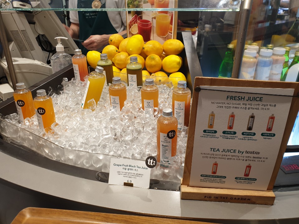 생과일 착즙 주스, 매일 아침 신선한 과일과 채소를 그대로 착즙한 수제 주스를 팔고 있습니다. 6,900원이라는 다소 높은 가격이네요.