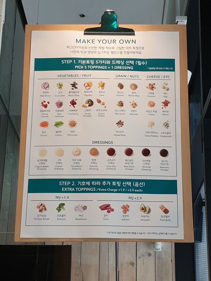 미리 정해진 메뉴가 아니라 자신이 좋아하는 재료들로 커스텀해서 샐러드를 완성할 수 있습니다. 5가지 재료 + 소스1개가 기본 토핑이고 더 선택할 경우 추가 요금이 발생합니다.