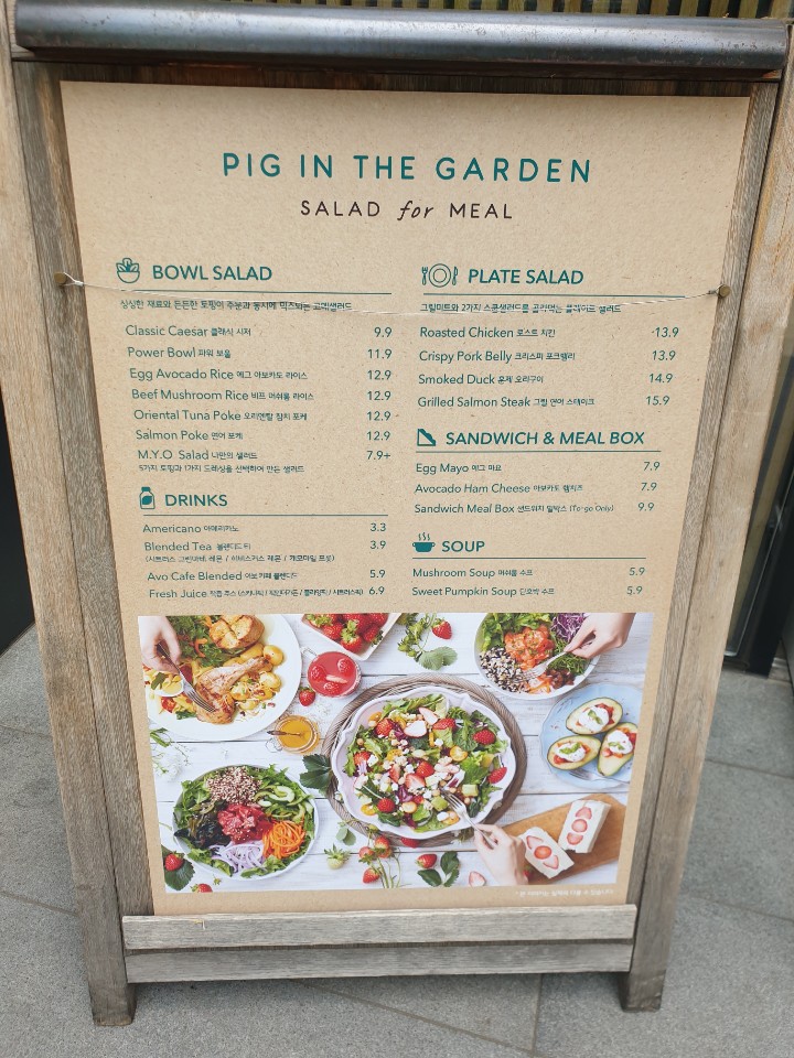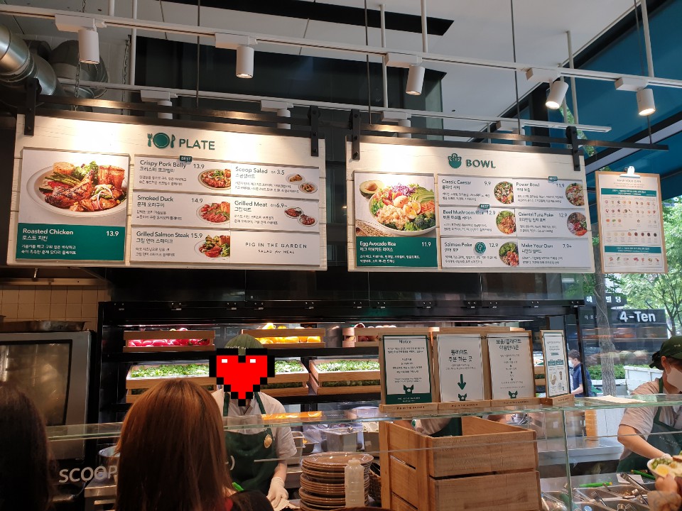 이곳은 고급형 샐러드를 파는 곳으로 BOWL에 담아주거나 접시에 플레이팅해줍니다. 가격대는 만원 초반대로 조금 비싼 가격대입니다. 사진만 보면 풀때기들만 있는 것 같지만 보면 단백질류로 돼지, 소, 닭, 오리고기 모두 팔고 있습니다.