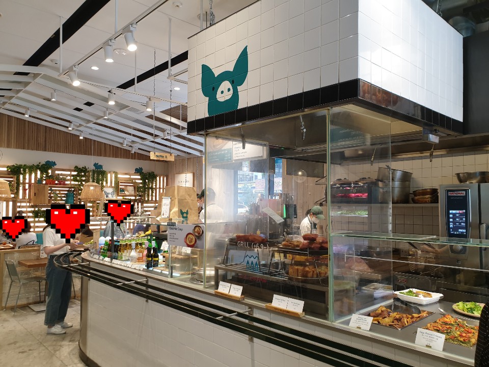 귀여운 돼지와 건강한 생명력을 뜻하는 초록색으로 멋지게 꾸며놓았습니다. 구루마?같은 곳에 싱싱한 과일과 채소들이 담겨 있어서 보기만 해도 몸이 디톡스가 되는 것 같네요.