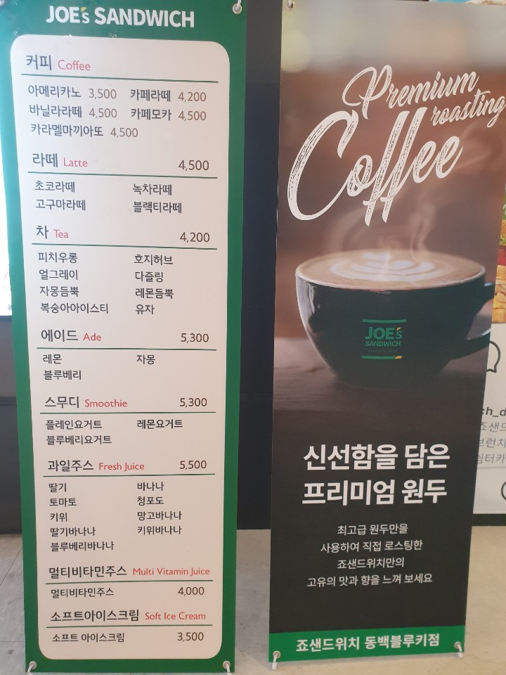 음료수로는 커피, 차, 에이드, 스무디, 과일주스등이 있습니다. 가격대는 4000~ 5000원 사이네요. 적당한 가격대인 것 같습니다.