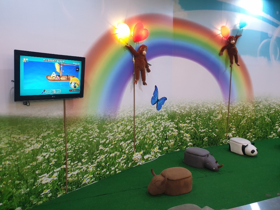 확실히 동백은 어린이를 동반한 가족들이 많이 살기 때문에 그들을 타겟팅해서 이런 시설들을 만들어 놓은 것 같습니다. 쇼핑을 하다가 지칠 때 커피 한잔 조용히 하고 싶은데 아이들이 귀찮게 하면 힘들잖아요. TV에 어린이용 애니메이션이 나오는 것 같았습니다.