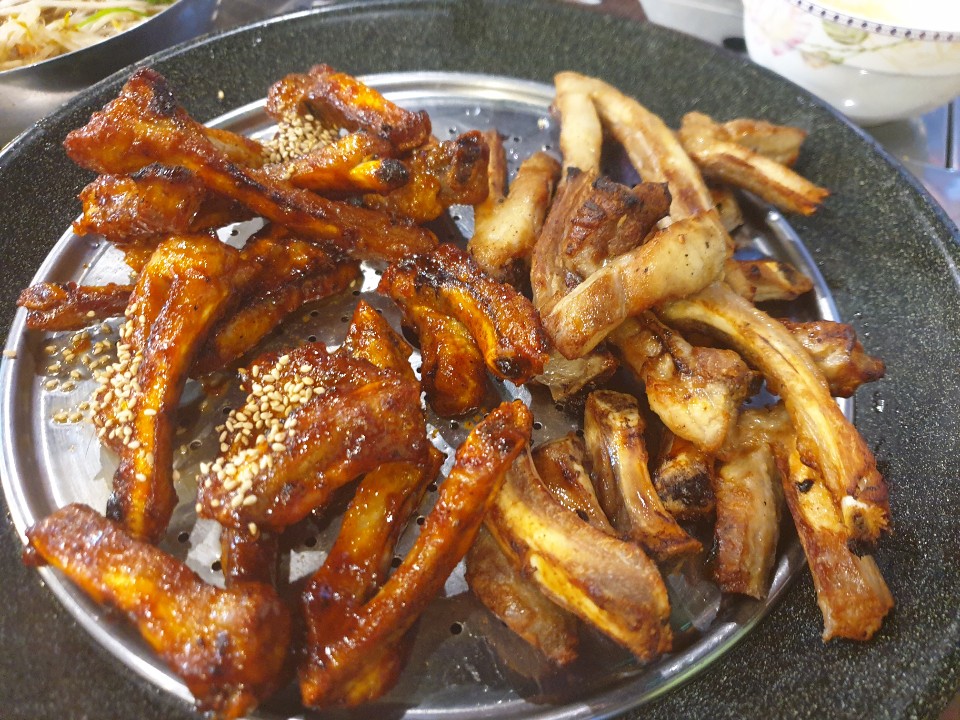 맛있게 구워져 나온 쪽갈비입니다. 이곳은 오븐을 활용해서 주방에서 미리 구워져 나오기 때문에 바로 먹을 수 있습니다. 고기 밑에는 뜨거운 물을 끓여서 촉촉함이 날아가지 않게 유지해줍니다. 매운맛은 깨가 솔솔 뿌려져 있어서 더 고소해 보이네요. 400g이지만 뼈 무게를 제외하면 그렇게 많은 양은 아닐 겁니다. 그래도 쪽갈비 자체가 가격대가 있는 부위이기 때문에 비싼 것은 아니라고 생각합니다.