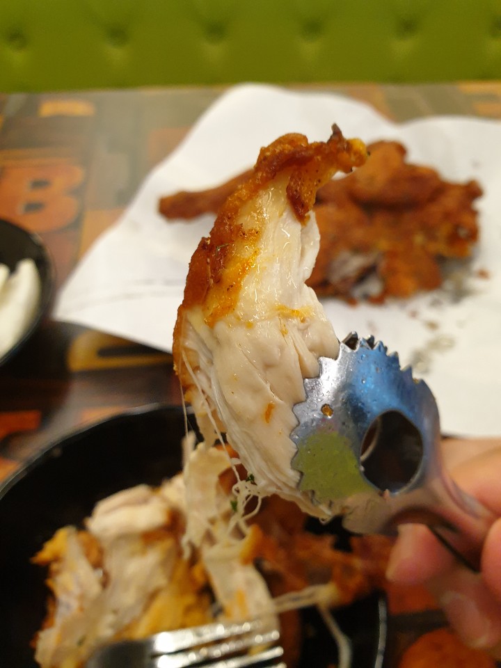 닭다리가 굉장히 얇아서 손가락 굵기 정도입니다. 살이 많이 붙어있지는 않지만 맛은 큰 치킨과 다름없습니다. 다만 아직 덜 자란 닭이라서 그런지 약간 질긴 느낌이 있습니다. 좋게 말하면 쫄깃한 것이고 나쁘게 말하면 질깁니다.