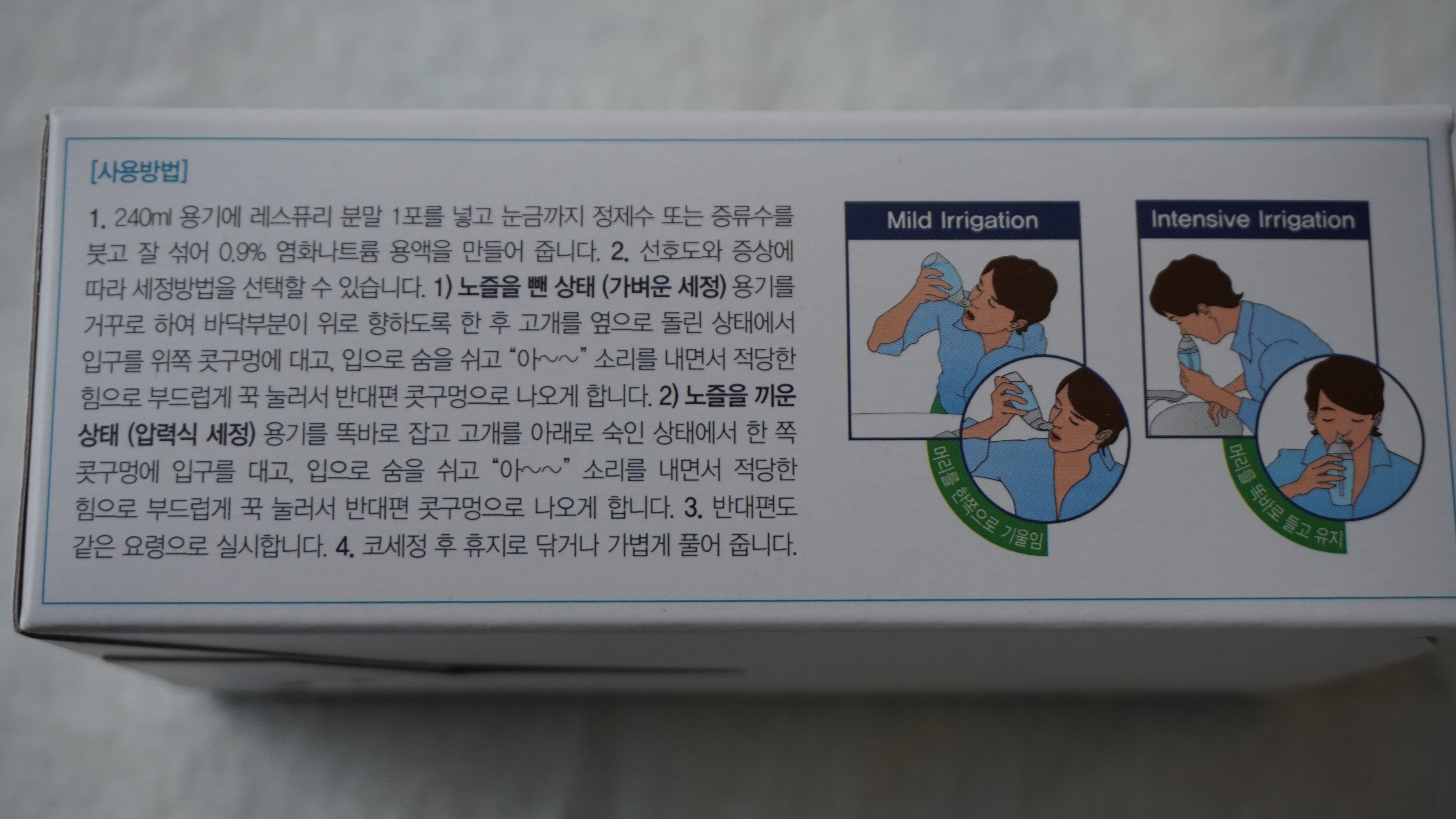 위에 보면 가벼운 세정이 있고, 강한 세정이 있는데 저는 간호사분으로 부터 강한 세정을 권유받았습니다. 사진의 강한 세정보다 더 머리를 숙이고 "아~"라고 말하면서 코를 풀는 것입니다. 처음 사용하면서 딱 느꼈던 기분은 '마치 수영장에서 실수로 물을 들이마셨을 때의 기분'이었습니다. 코에 짠기? 같은 것들이 한바뀌 돌고 나오는 기분이라서 정말 별로였습니다. 그래도 계속하다 보면 적응이 됩니다.