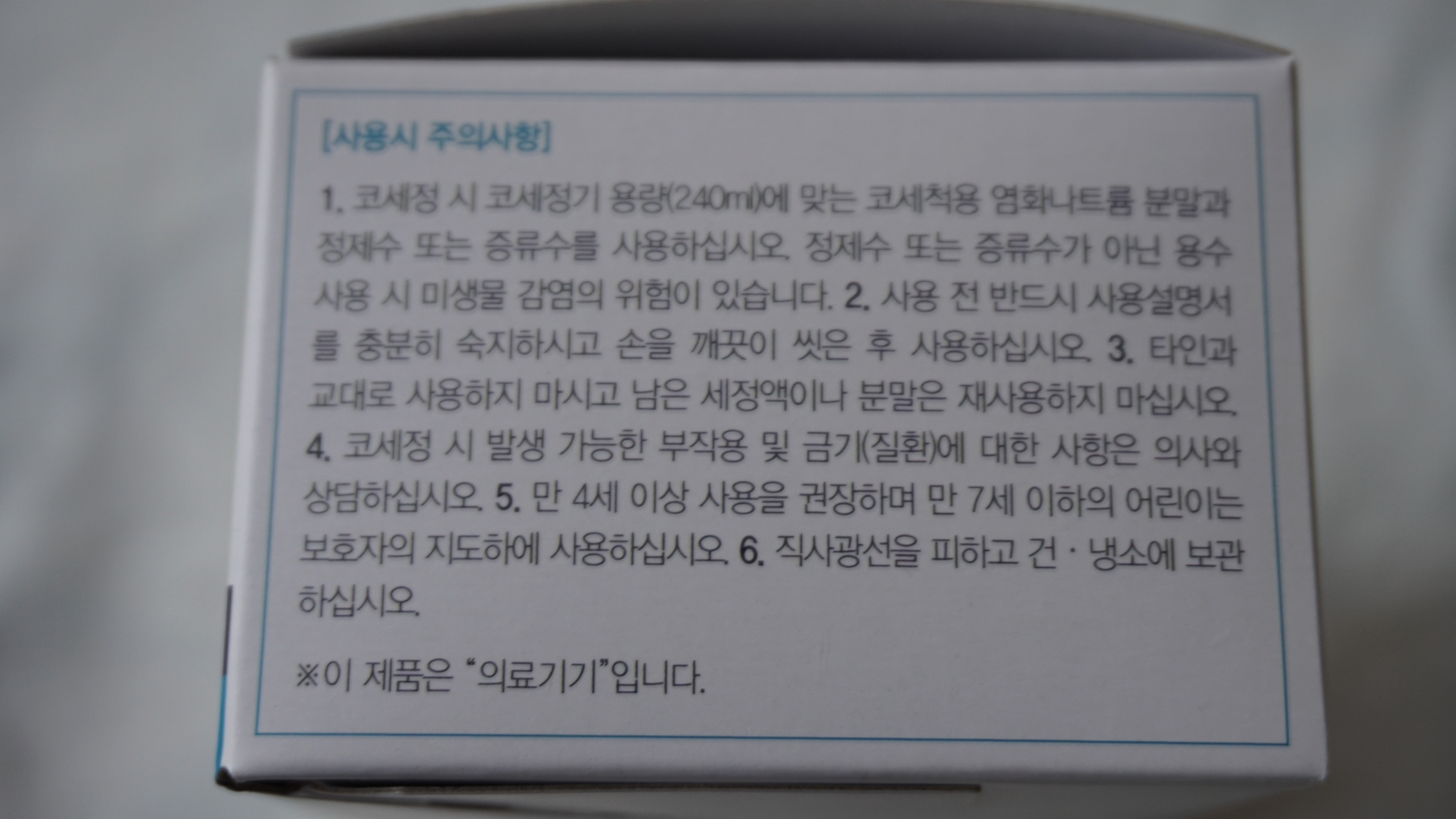 또 자다가 입으로 숨을 쉬게 되니까, 목이 건조해져서 목감기에 쉽게 걸리게 되는것 같아요. 그래서 병원에 갔더니 코 세척을 자주 해주면 좋다는 사실을 알려주었습니다. 코세척기와 코 세척 분말을 구입하게 되었습니다.