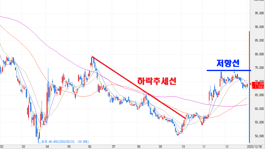 6월부터 이어져온 하락 추세선을 깨고 돌파한 후 조정을 받고 있는 상황입니다.