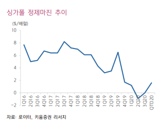 올해 2분기에 정제마진이 마이너스까지 기록하다가 올해 4분기부터 반전하는 모습을 볼 수 있습니다.