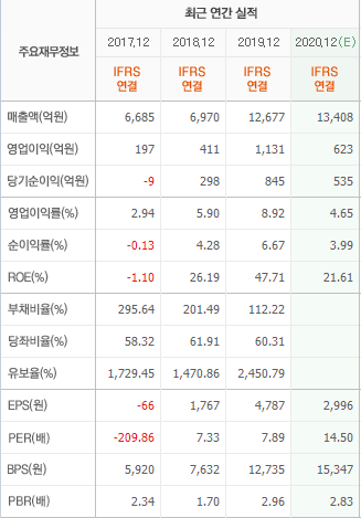 부채비율이 재작년 200%에서 점차 줄어들어 현재는 100%대로 떨어지고 있어 긍정적으로 보입니다. 또한 20년 PER이 15로 다소 올라간 것처럼 보이지만, 21년 예상 PER을 적용해보면 9.3배 정도로 그렇게 높은 수준은 아니라고 판단됩니다. 계산방법은 예상 영업이익을 적용하였습니다. 21년 예상 영업이익이 1030억 원으로 EPS(주당순이익)은 4,600원으로 예상되는데 이를 현재 주가로 나누면 PER(주가/주당순이익)이 됩니다. 그럼 9.8배가 나오는 것이죠. 동일업종인 삼성전기가 22배, LG이노텍이 32.4배를 받는 것을 생각하면 오히려 낮은 수준입니다.