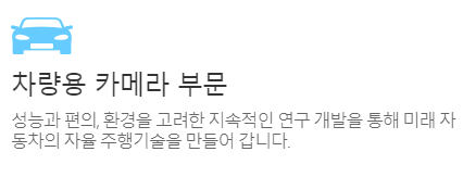 최근 출시되는 차량에는 기본으로 전방과 후방에 카메라를 장착하는 것이 점차 필수사양으로 채택되고 있습니다. 이제는 주차를 할 때 고개를 돌려서 뒤를 보는 것이 어색하게 느껴질 정도이죠. 카메라를 통해서 후방을 모두 볼 수 있기 때문입니다. 또한 전방 카메라는 운전자의 전방 사각지대를 모니터링해서 안전한 주행을 돕는 역할을 합니다. 주요 매출처로 현대, 기아, 르노삼성 등이 있습니다.