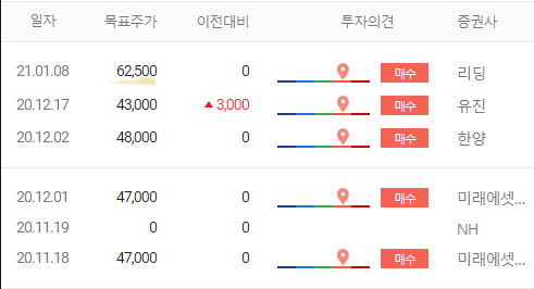 증권사들의 목표주가는 43,000원부터 62,500원까지 제시되고 있습니다. 가장 높게 측정한 것이 62,500원인데 예상 PER을 13배를 적용한 것으로 보입니다. 향후 전장 카메라 산업의 성장성을 대입해본다면 더 높게 측정해도 된다고 개인적으로 생각합니다. 보수적으로 생각해도 5만 원선은 터치가 가능할 것으로 기대되네요.