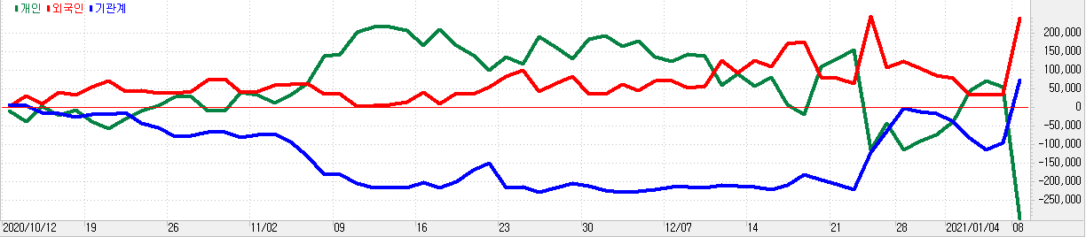 1월 8일 급등하였을 때 개인이 대량 매도를 하고 외국인과 기관이 매수를 한 것을 알 수 있습니다. 요즘에는 정말 개인이 기관들보다 현명하게 주식을 하고 있는 것처럼 보이네요. 기관과 외국인이 매수를 들어왔으니 한동안은 랠리가 이어질 것으로 생각됩니다.