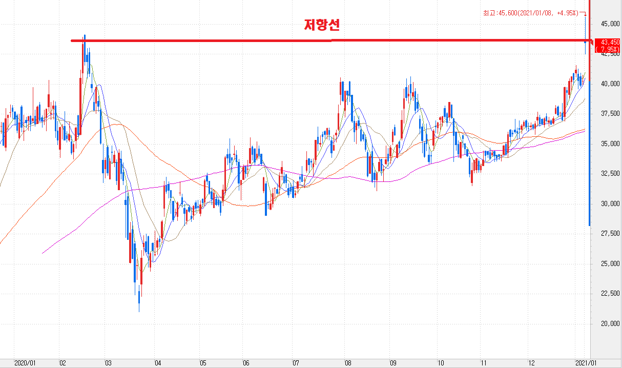 애플 카와 관련된 이슈 덕분에 갭상승을 하여서 현재 4만 3천 원의 저항선 부근에 걸쳐있는 것을 볼 수 있습니다. 돌파매매를 하시는 분들은 매수를 들어가기에 가장 적절한 위치라고 생각됩니다. 손절라인은 4만 원 부근으로 잡고 스윙을 해보시면 좋을 것 같습니다.