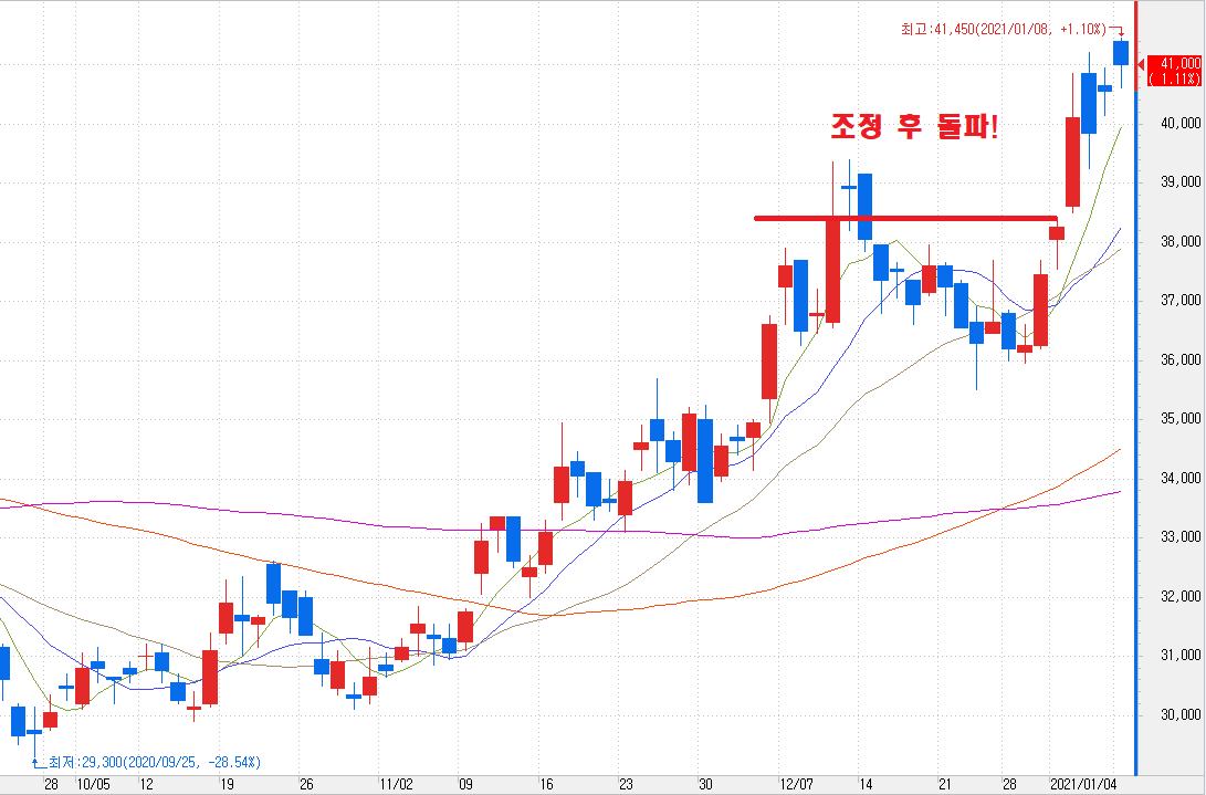 지난 9월 25일에 최저점인 29,300원을 찍고 계속해서 우상향 하다가 38,500원에서 저항을 받았습니다. 그리고 2주 정도 조정을 거친 후 미국 블루웨이브와 코스피 대상승 시기에 4만 원을 시원하게 돌파한 모습입니다.