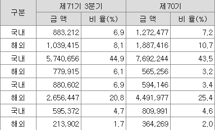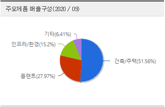 국내외 매출 비중은 사업부 분마다 다르지만 종합적으로 58%, 42%로 고르게 분산되어 대내외 불확실성에 따른 이익 변동성이 낮고 수익성이 양호한 편입니다. 다만 건축/토목분야는 국내 매출이 절대적으로 높아 정책의 영향도를 피하기는 어려울 것을 보입니다.