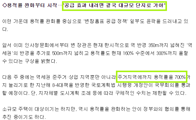 최근 행보를 보면 단순히 주장이 아니라 실무적으로 이행될 가능성이 크다고 판단됩니다. 용적률은 완화하는 법안이 국회에 통과할 예정이기 때문입니다. 이는 현형 400~500%에서 700%로 상향하고, 개발을 빠르게 진행시키겠다는 의지로 표현됩니다.