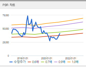 PBR차트를 보시면 현재 41,000원으로 0.66배를 받고 있습니다. 이전 5년 평균이 0.8배에 한참 못 미치는 수준입니다. 올해 매출액이 증가하여 영업이익이 올라가게 된다면 보수적으로 측정해도 0.7배 이상을 받게 될 것으로 보입니다. 참고로 PBR 0.7배의 가치는 45,000원입니다.