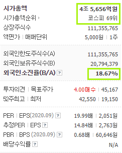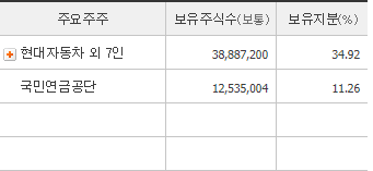 현대자동차 외 7인의 보유지분이 34%로 가장 큰 대주주입니다. 국민연금공단이 11.26%로 2대 대주주입니다. 시가총액 4조 5천억 원으로 코스피 69위에 위치해 있습니다. 외국인 주주의 비율은 18.67%입니다.