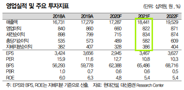 현대건설은 올해 신규수주 목표치를 28조 원으로 제시하였습니다. 코로나 19 상황에서도 신규 수주가 호조를 보인 것이죠. 또한 해외사업장에서 선제적 비용 반영으로 2021년도에 비용 비담이 감소하였습니다. 또한 폐기물, 바이오가스, 수소, 풍력 등 신사업 가치가 점차 가시화될 전망입니다. 그 결과, 올해 예상 영업이익은 작년 대비 24% 상향되어 8220억 원을 기록할 것으로 보입니다. ROE 또한 0.6% 상승하여 5.4%로 측정되었습니다.