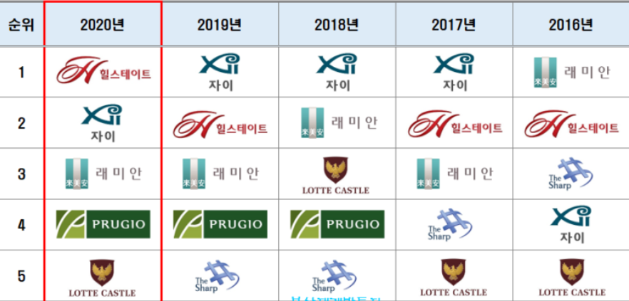 매년 11월 경에 부동산 114에서 아파트 브랜드 선호도 조사하여 결과를 발표합니다. 이 조사 결과에서 2020년도 아파트 브랜드 1위에 현대건설의 힐 스테이트가 뽑혔습니다. 그 밑으로 GS 자이, 삼성 래미안, 대우 푸르지오, 롯데 캐슬, 대림 이 편한 세상 등이 뒤를 이었습니다