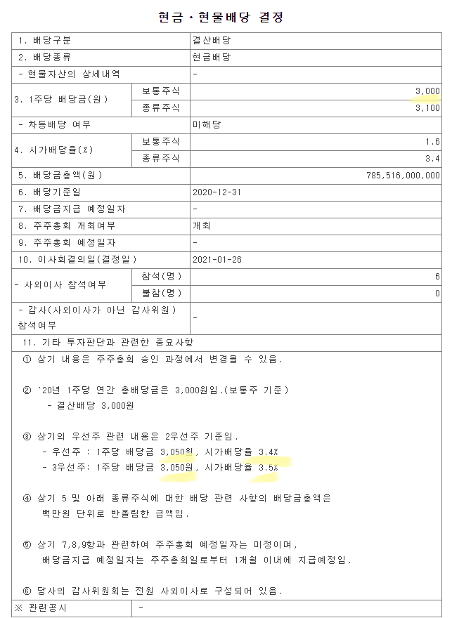 올해도 마찬가지로 3000원의 기말배당금을 지급한다고 하였습니다. 배당기준일이 2020년 12월 31일이기 때문에 배당을 받을 수 있는 권한을 가진 주주는 현대차를 2020년 12월 29일까지 보유하고 있었던 분들입니다. 시가배당률을 우선주는 3.4%, 3우선주는 3.5%입니다. 배당금 지급 예정일자는 주주총회일로부터 1개월 이내에 지급 예정입니다. 작년의 경우는 4월 17이였습니다. 올해도 큰 이변이 없는 한 4월 중순에 입금 될 것이라고 전망하고 있습니다.