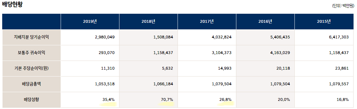 2018년도에 자동차 판매가 호황이었을 때는 배당성향(잉여 이익금을 배당으로 주는 비율)이 70% 가까이 되었지만 2019년에는 판매가 부진하여 35.4%밖에 줄 수 없었습니다.