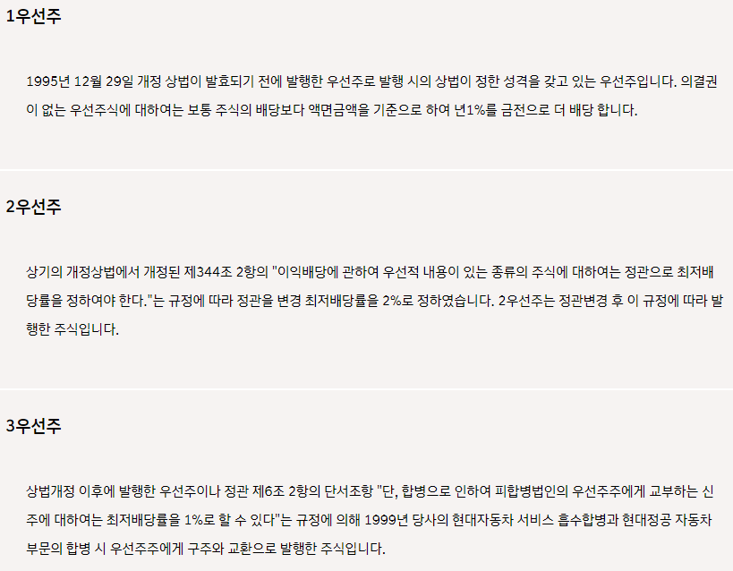 1우선주(현대차 우선주)의 경우는 가장 오래된 구형 우선주이며 "의결권이 없는 우선주식에 대하여는 보통 주식의 배당보다 액면 금액을 기준으로 하여 연 1%를 금전으로 더 배당합니다."