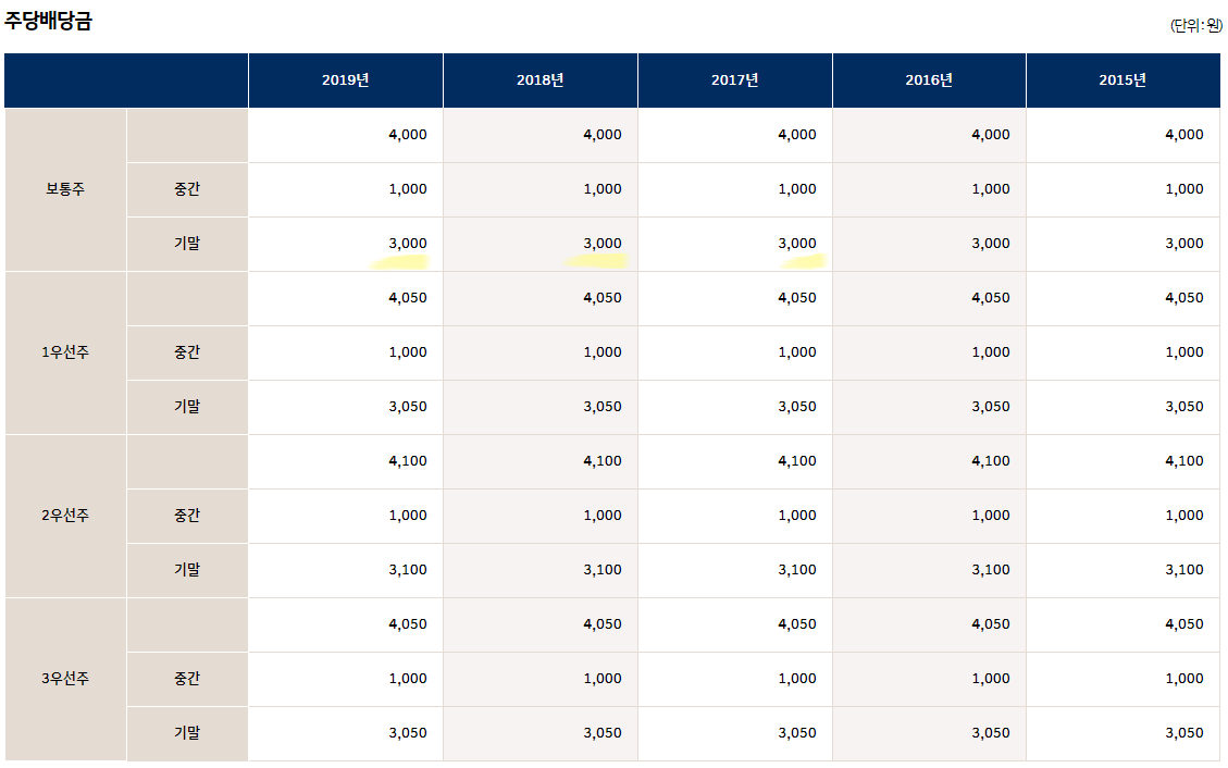 현대자동차는 기말 배당금으로 꾸준히 3000원을 배당해오고 있습니다. 중간배당과 기말배당이 있는데 2020년에는 중간배당을 하지 않았습니다. 중간배당의 경우는 7월에 1000원을 통상적으로 지급해왔습니다.