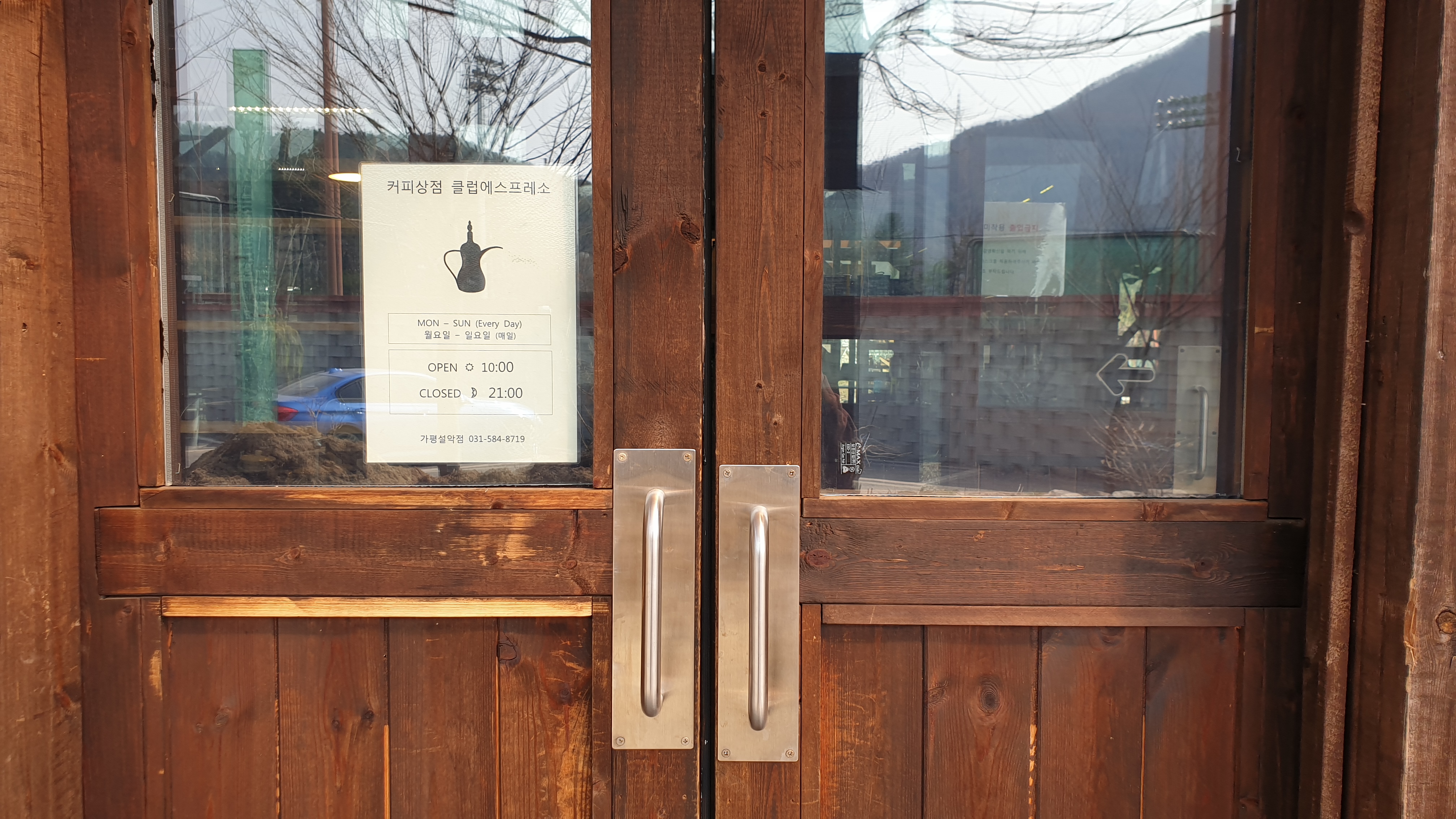 커피집 영업시간입니다. 매일 오전 10시부터 오후 9시까지 영업합니다. 가평설악점이라고 적혀있는 것을 보니 다른 지점도 있나 보네요. 미닫이 문이라서 양쪽으로 열어야 합니다. 이곳의 대문들은 대부분 미닫이로 되어있습니다.