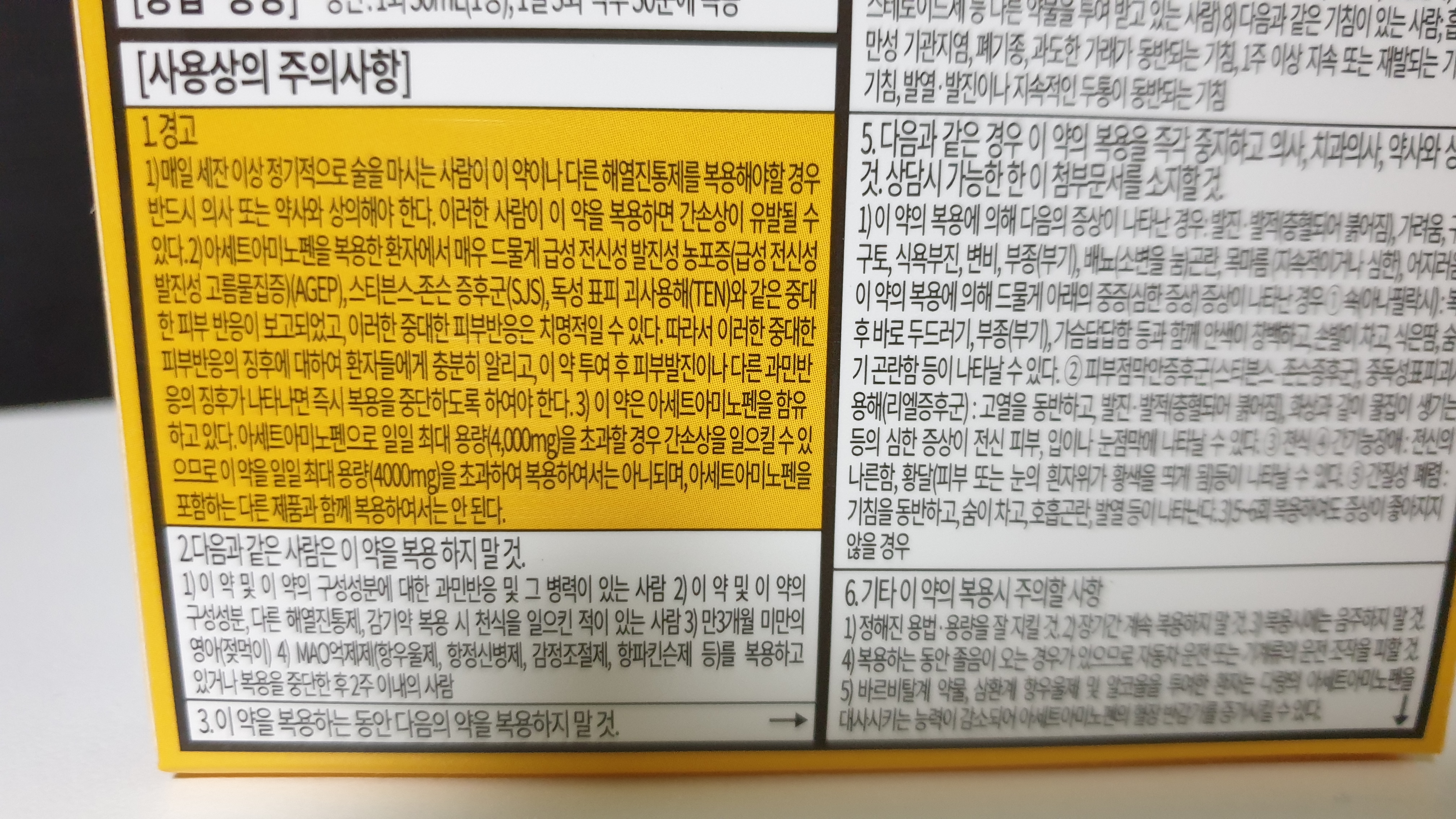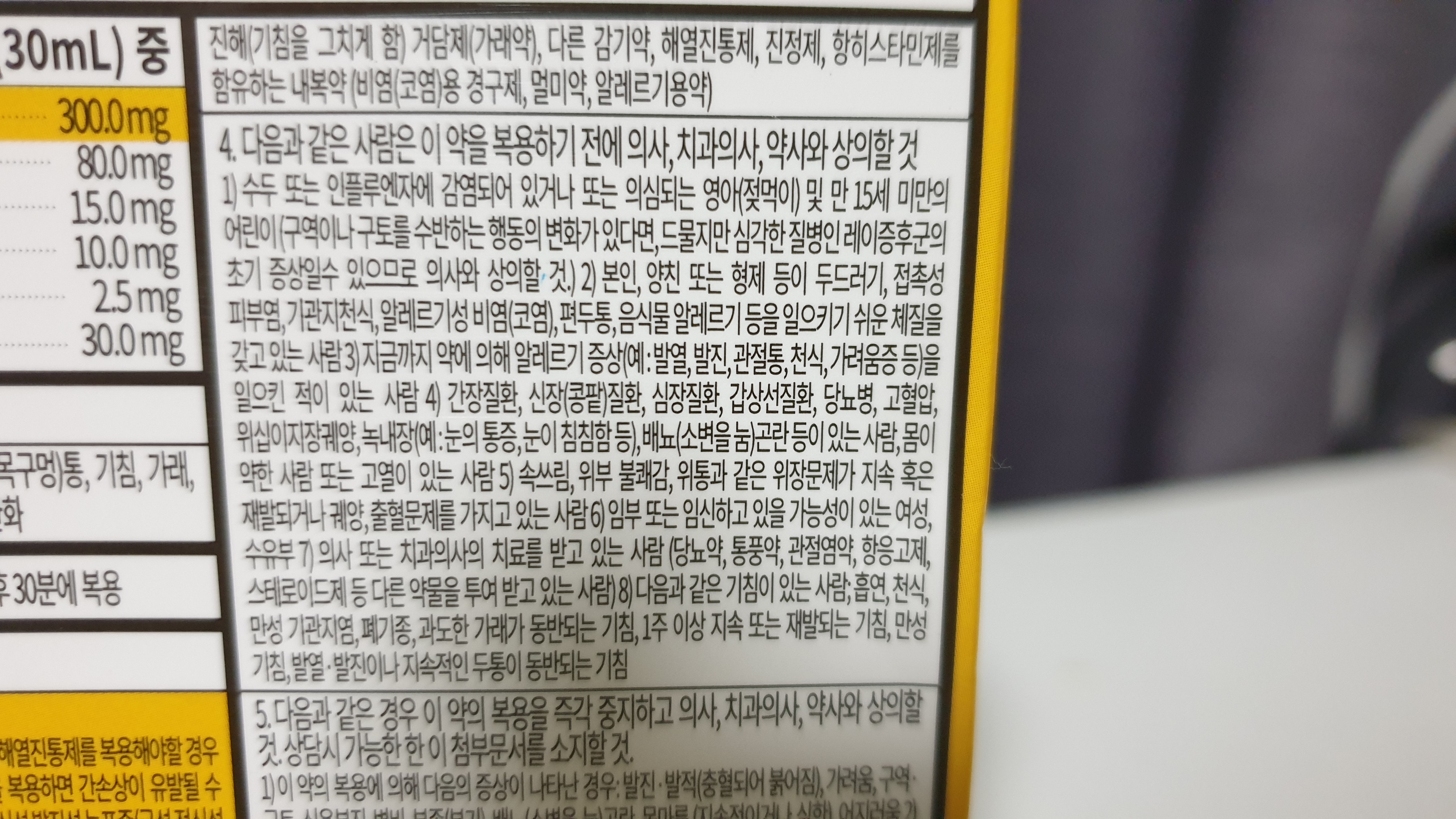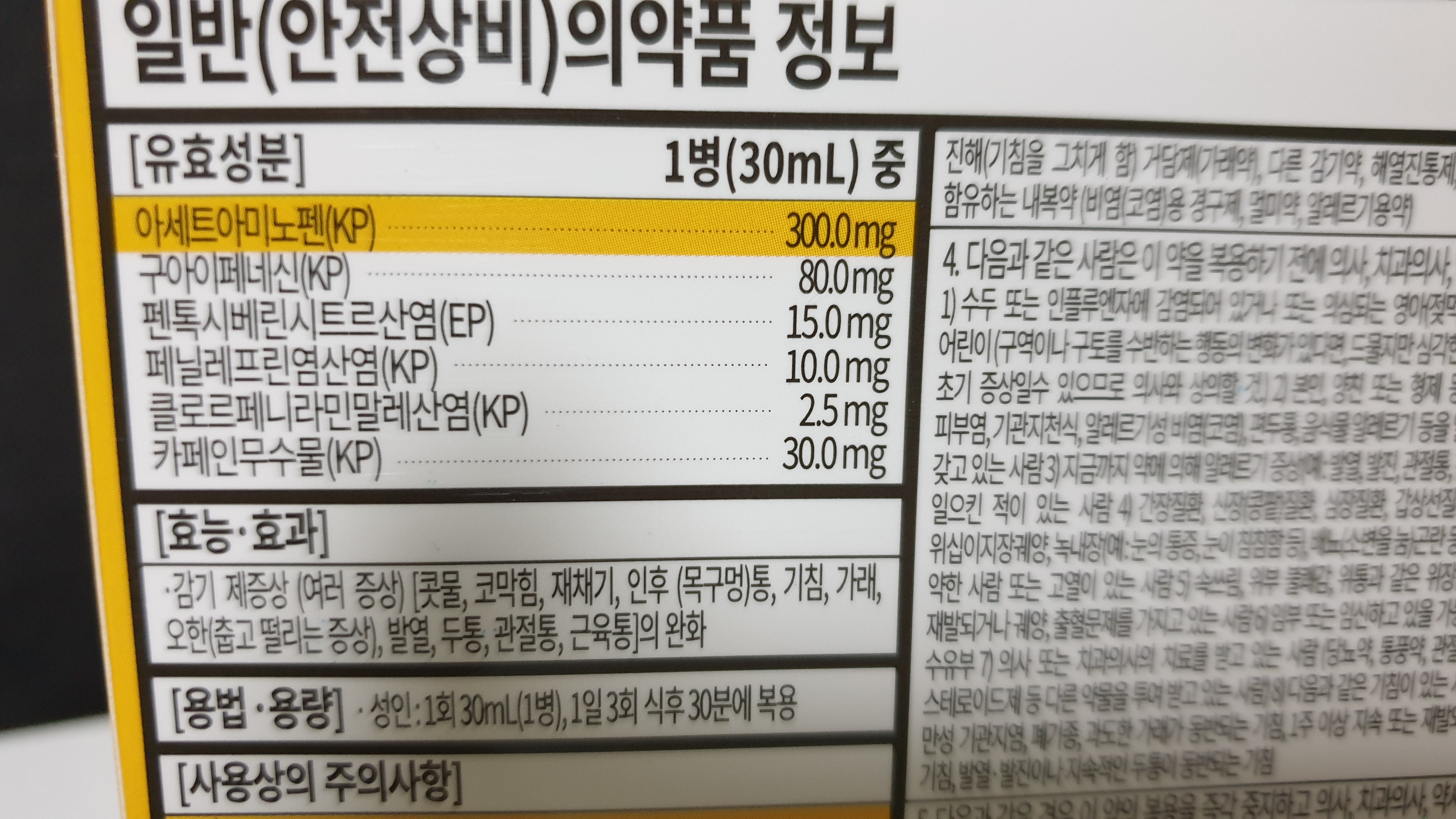 아세트아미노펜이 노란색으로 강조되어 표시되어있습니다. 타이레놀에 들어간는 성분으로 해열과 진통에 효과가 있는 것으로 알고 있습니다. 그외에 구아이페네신, 펜톡시베린시트르산염 등이 있네요.