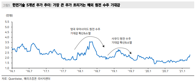 최근까지는 원전수주에 따라서 주가가 크게 올라가는 패턴을 보여주었습니다.
