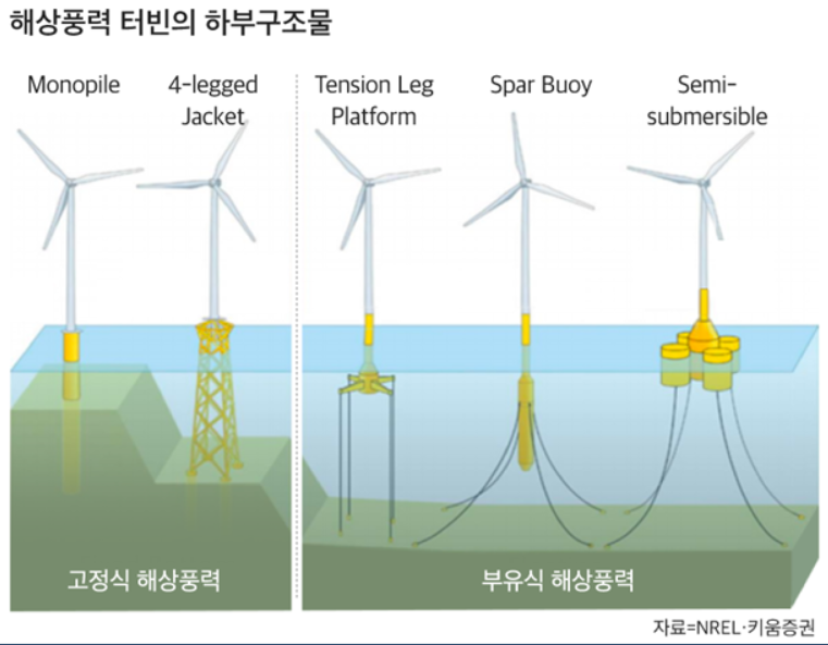 위와 같이 고정식 혹은 부유식을 사용하여 타워를 세우는 것인데요.
