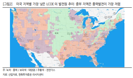 위의 차트를 보시면 지역별로 어떤 친환경 에너지가 비용 대비 효과가 좋은지 나와 있습니다.