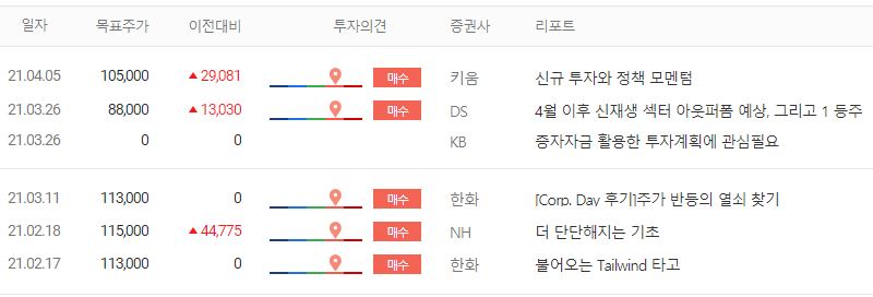 증권사 평균 목표주가는 10만 5천 원으로 현재 가격 대비 45% 상승여력이 있습니다.