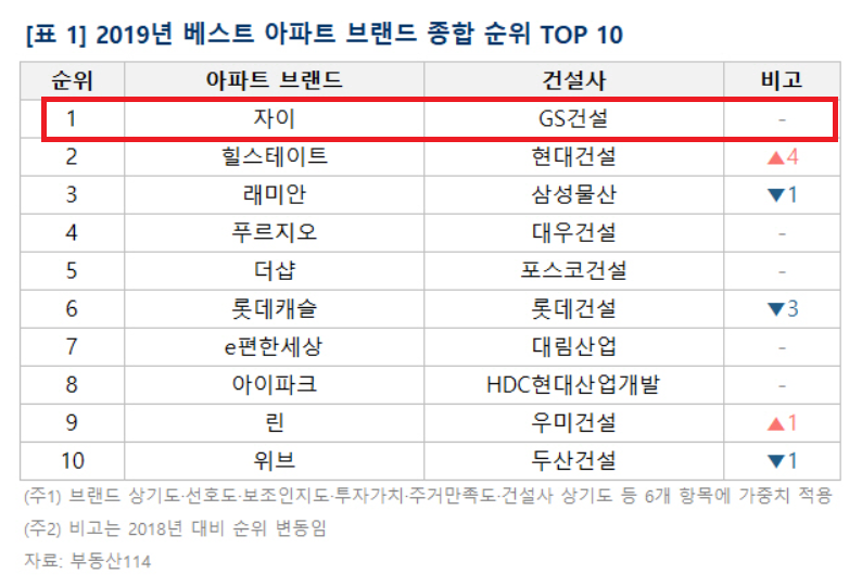GS건설의 아파트 브랜드인 자이는 여러 대형 건설사들의 브랜드를 제치고