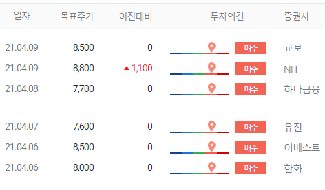 가장 높은 목표주가는 교보증권이 제시한 8500원이며 가장 낮은 금액은 유진증권의 7,600원입니다. 평균적으로 8000원 정도로 보입니다. 현재가 대비 17% 정도 상승여력이 있습니다. 올해 목표 수주액이 1조 원을 돌파할 것으로 보이며 주택부분에서 강한 턴어라운드가 예상되는 만큼 국내 건설주 대표 중에서 가장 실적이 기대되는 기업입니다. 추가적인 수주현황과 분양성적을 확인하시면서 매수하면 좋을 것 같습니다.