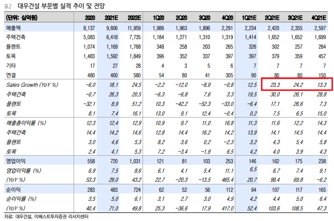 분기별 성장률을 보면 매분기 20%이상의 성장을 보여주고 있습니다. 특히 주택건축 부분은 30% 가까운 상승률로 성장을 이끌고 있습니다. 또한 적자폭이 컸던 플랜트 부분의 마진 개선에 따라서 2021년에는 영업이익이 크게 개선될 것으로 보고 있습니다. 이에 따라 여러 신용평가기관은 대우건설의 신용등급을 상향 조정하였습니다.