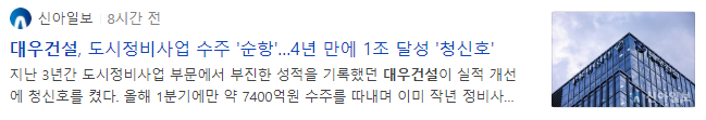 이에 오늘은 실적이 완전히 성장 궤도에 오른 대우건설의 주가에 대해서 알아보도록 하겠습니다. 이미 1분기 매출액은 2.1조원, 영업이익은 1600여 원으로 전년 동기 대비 5%, 36%의 성장률을 기록할 것으로 추정됩니다.