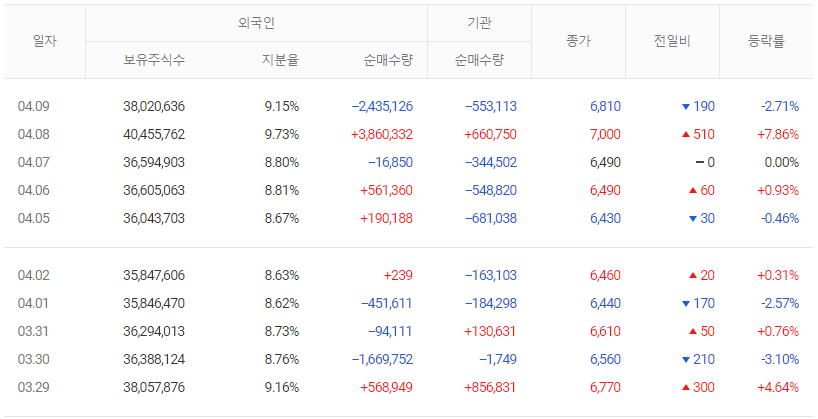 최근 며칠간 외국인이 매수세를 유지하다가 지난주 금요일에 일부 차익실현을 한 것으로 보입니다. 현재 외국인 지분율은 9.15%이며 종가는 6,810원으로 형성되어 있습니다.