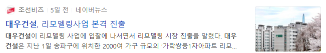 또한 대우건설은 올해 리모델링 사업에도 본격적으로 진출할 예정입니다. 리모델링 부분 수주 목표는 연간 3천에서 5천억 원으로 잡았습니다. 회사 내에 리모델링 사업팀을 신설하여 적극적으로 수주를 해나갈 것으로 보입니다.