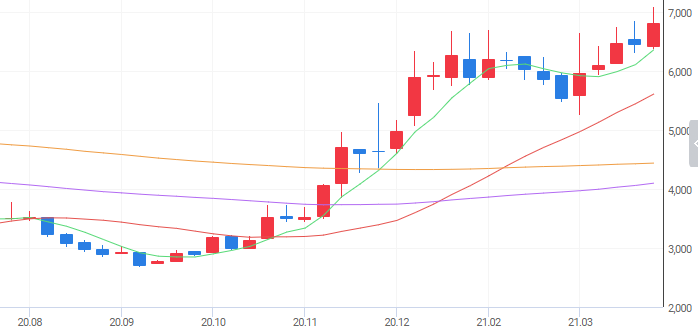 지난해 9월부터 본격적인 상승세를 이어가면서 올해 2월까지 상승하였습니다. 이후 한 달가량 조정을 받다가 최근 52주 전고점을 돌파한 상태입니다. 6000원 초반의 저항선을 돌파하여 상승추세를 유지하고 있습니다.