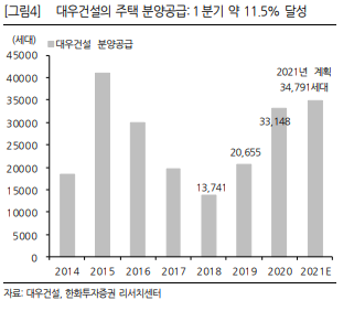 건설업은 1분기 계절적 비수기임에도 불구하고 지난 4분기 성수기 매출액인 2조 3천억원가량의 97.5%가량이 이번 분기에 달성 가능할 것으로 보입니다. 이는 2020년 3.3만 세대의 강한 분양 공급을 바탕으로 주택 부분의 턴어라운드가 가시화될 것으로 판단했기 때문입니다. 올해는 작년보다 많은 3만 4천여 세대를 계획하고 있어서 주택부분 매출액은 계속해서 증가할 것이라고 보고 있습니다.